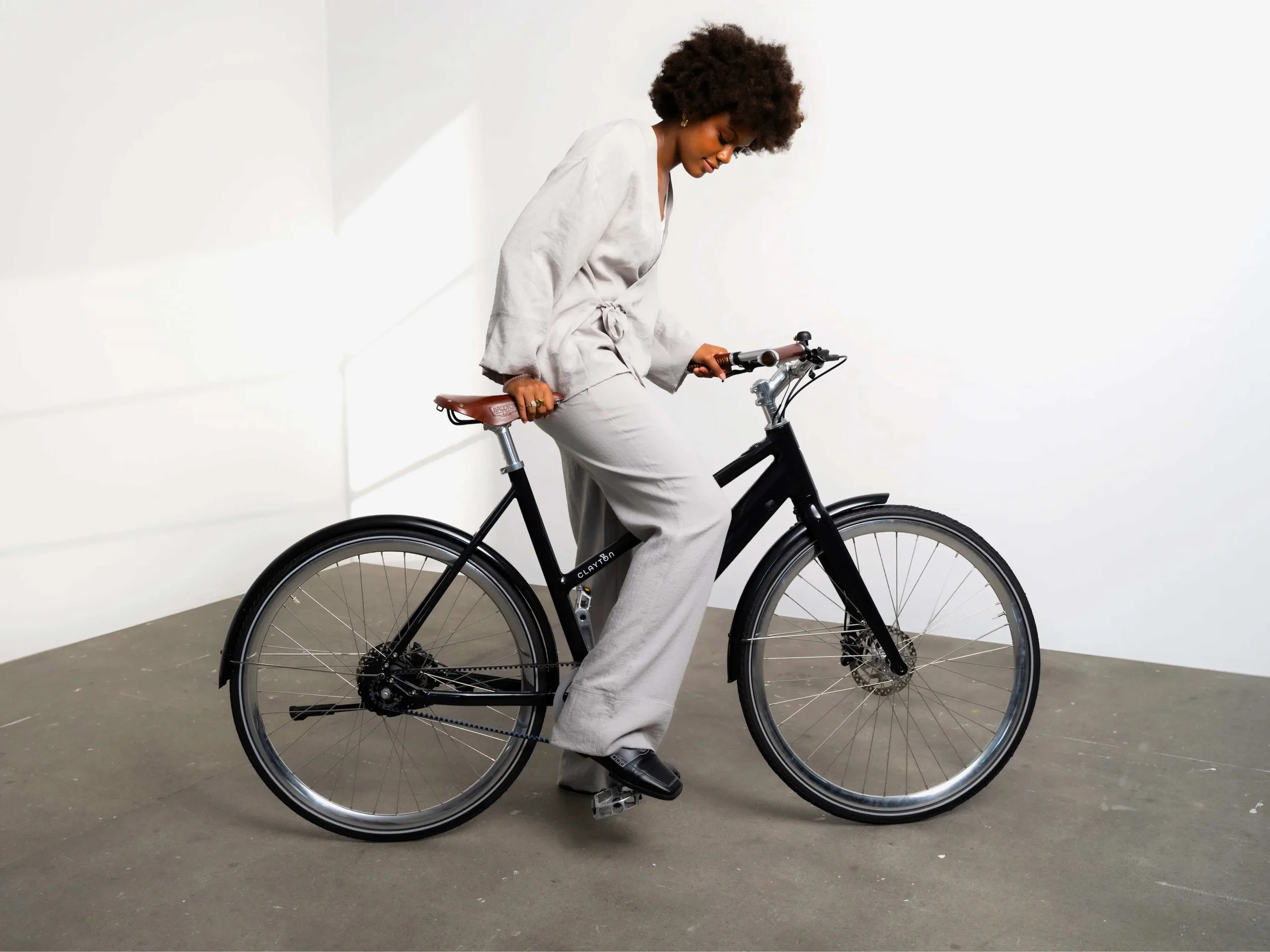 Es ist kein Display im eigentlichen Sinne vorhanden, sondern ein Knopf - dieser ist am Oberrohr integriert und nicht am Lenker befestigt. Auch das zahlt darauf ein, dass das E-Bike als Fahrrad mit Elektroantrieb nicht sofort auffällt. Die Verbindung zu einer App wird über Bluetooth unterstützt. Die LED-Beleuchtung ist in den Lenker und die Sattelstange integriert, das 19 Kilogramm schwere E-Bike lässt die für Trekking-E-Bikes typischen Ausstattungsmerkmale - also etwa eine Federgabel, aber auch einen Gepäckträger und Schutzbleche vermissen. Genutzt wird ein Brooks B17-Sattel.