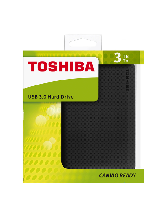 Toshiba bietet seine externe Festplatte Canvio Ready mit Speicherkapazitäten von 500 GB, 1 TB, 2 TB, 2,5 TB oder 3 TB an. Das 3-TB-Modell ermöglicht laut Toshiba die Speicherung von bis zu 856500 digitalen Fotos (6 MP, 3,5 MB), 789000 digitalen Musikdateien (128 KB/s, 4 min) oder 2460 digitalen Filmen (13,5 MB/s). Dank der abwärtskompatiblen USB-3.0-Schnittstelle lassen sich die portablen HDDs auch mit älteren Geräten verwenden, an Rechnern mit USB 3.0 sind Datentransfers flott erledigt.