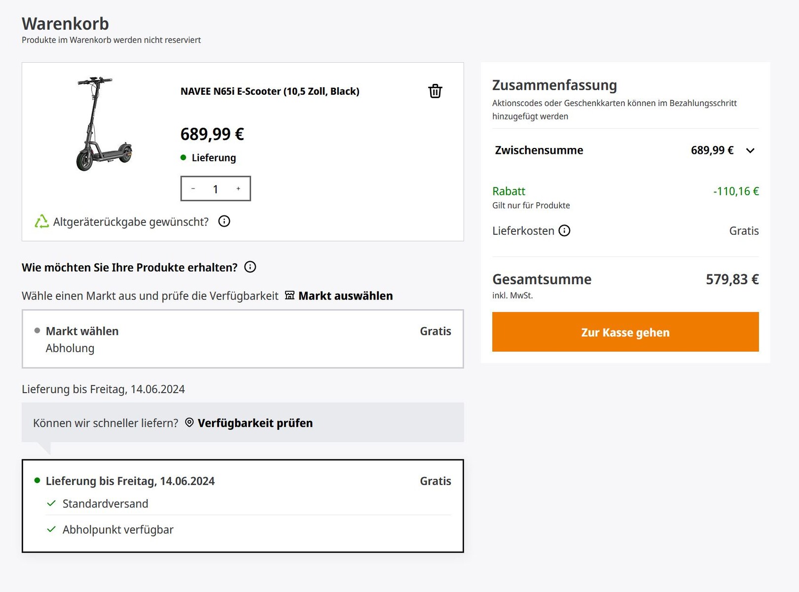 Bei MediaMarkt und Saturn steigt noch bis zum morgigen Montag (10. Juni) um 9 Uhr eine Mehrwertsteuer-geschenkt-Aktion. In dessen Rahmen lässt sich die Mehrwertsteuer auf zahlreiche Produkte sparen, was zu diversen attraktiven Angeboten führt. Darunter auch für den Navee N65i, einem noch recht neuen E-Scooter mit deutscher Straßenzulassung.