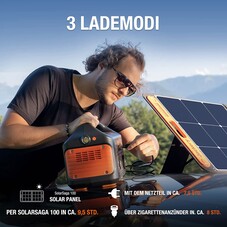 Geladen werden kann die Powerstation über das Stromnetz, eine Autobatterie oder eben das beim Jackery Solargenerator 500 beiliegende Solarsaga 100W. Hierbei handelt es sich um ein maximal 100 W leistendes Solarpanel, mit dem die Powerstation unter Idealbedingungen in ca. 9,5 Stunden über die Sonnenenergie wieder augeladen ist.