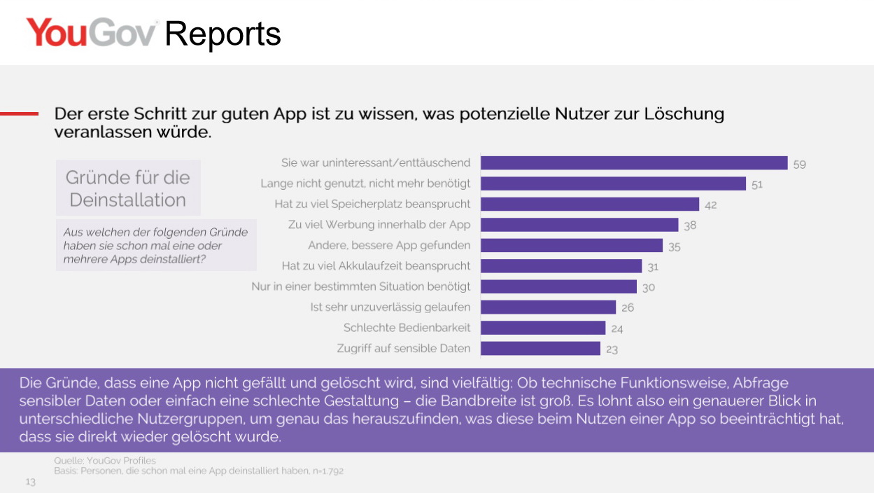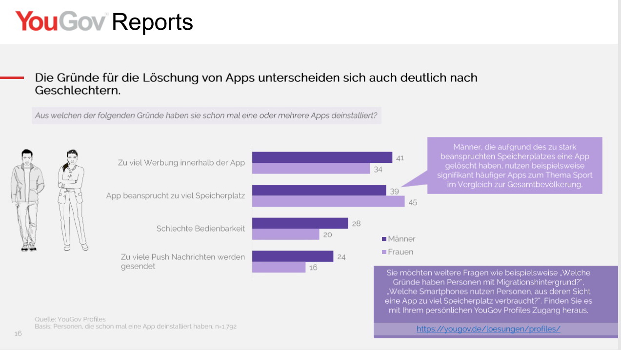 Ebenfalls häufig genannt: Die App wurde lange nicht mehr benutzt bzw. nicht mehr benötigt (51 Prozent). Weitere Gründe sind ein zu großer Verbrauch von Speicherplatz durch die App (42 Prozent), zu viel Werbung während der Anwendung (38 Prozent) oder dass einfach eine andere, bessere App gefunden wurde (35 Prozent). Dies sind die Ergebnisse der Studie App in die Tonne des internationalen Marktforschungs- und Beratungsinstituts YouGov.