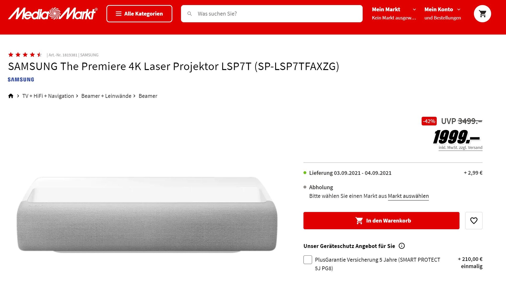 Samsung hat im Vorjahr mit dem Modell LSP7T, auch als Samsung The Premiere Laser-Projektor bezeichnet, ein spannendes Produkt auf den Markt gebracht, das mit anfangs über 3.000 Euro allerdings nicht gerade günstig war. Der reinrassige 4K-Fernseher mit voller Tuner-Bestückung (DVB-C. DVB-T, DVB-S) sank im Verlauf des letzten Jahres auf etwa 2.600 Euro Marktpreis, wird bei zwei Händlern aktuell aber erstmals unter 2.000 Euro verscherbelt.