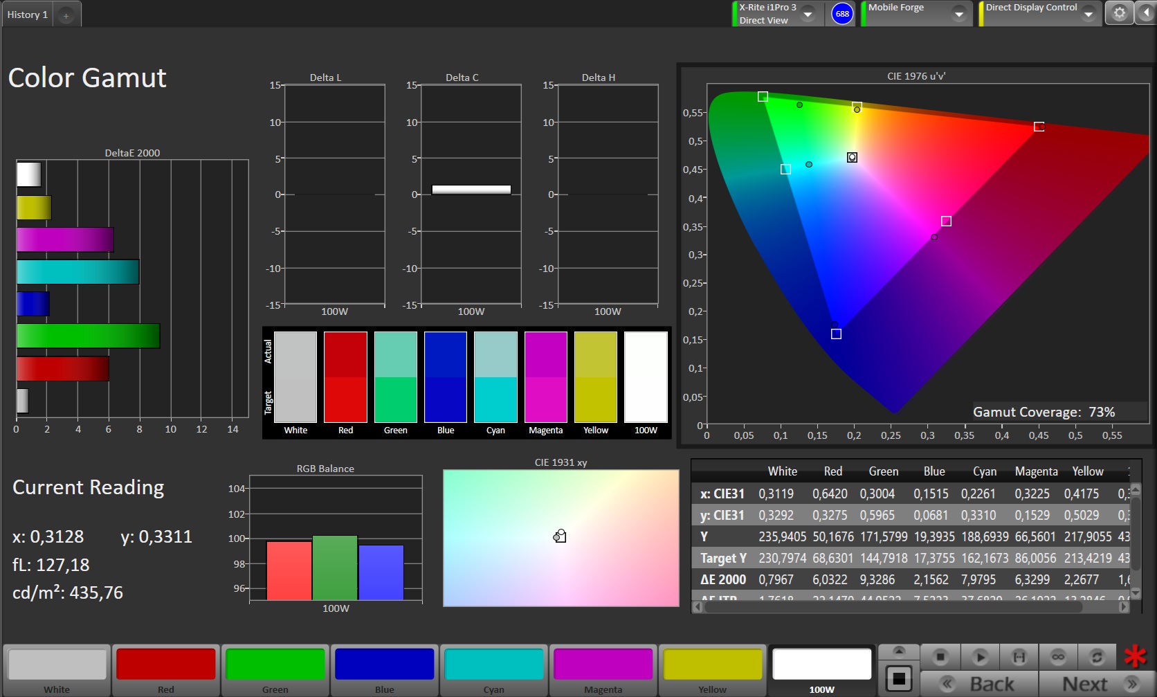 Die Farbkalibrierung untersuchen wir mit der Analysesoftware Calman. Unsere gemessenen DeltaE-Werte im sRGB-Farbraum liegen deutlich innerhalb des Zielbereiches (<3) und die Unterschiede zu den Referenzfarben sind nicht erkennbar.