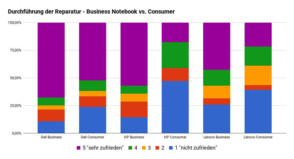 Einen wirklichen Vorteil für Besitzer von Dell-Business-Laptops mit entsprechendem Support kann man zumindest bei Inanspruchnahme der Telefonhotline nicht ausmachen. Im Vergleich mit den Angaben aus der Consumer- und Gaming-Rubrik sind hier keine nennenswerten Unterschiede zu erkennen. Bei HP und Lenovo sind im Consumer-Segment vergleichsweise mehr unzufriedene Kunden zu finden. Unter den drei gewählten Business-Brands ist die Zufriedenheit bei HP am höchsten.