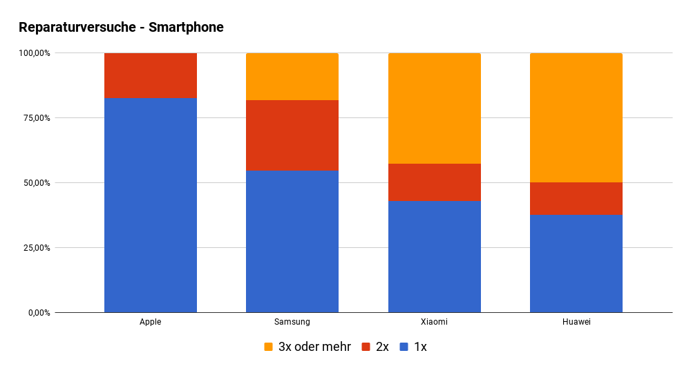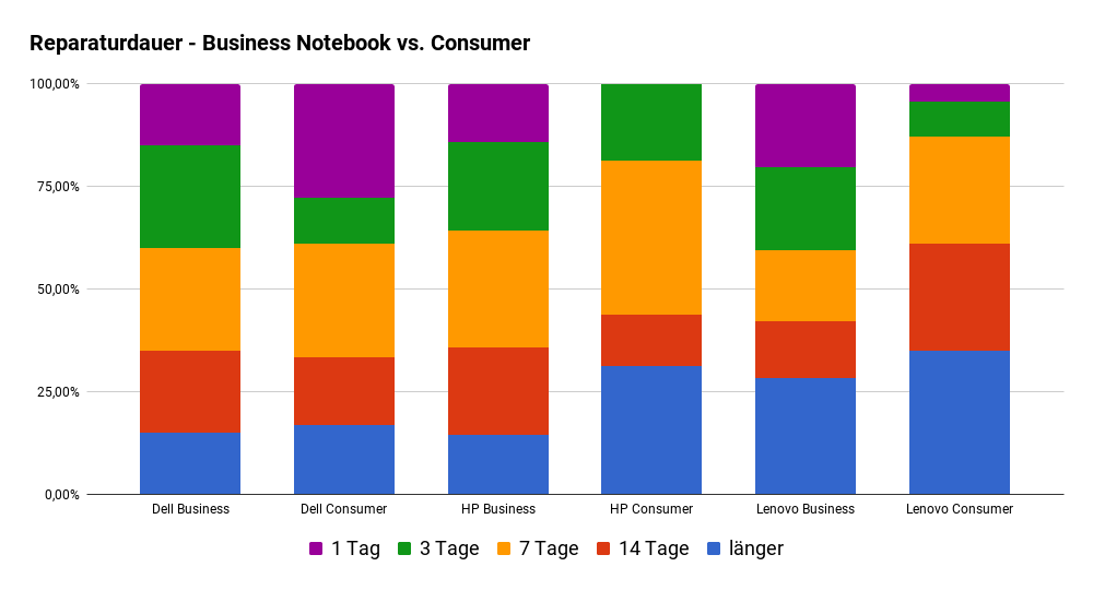 Mit mehr als 50% der Reparaturen außerhalb der Herstellergarantie bzw. außerhalb einer optionalen Garantiererweiterung liegt Apple in dieser Reihung klar voran. Als mögliche Ursachen kann die vergleichsweise knappe Standardgarantie oder aber auch die hohe Wertstabilität bei Apple-Produkten angeführt werden. Den größten Anteil an Reparaturen innerhalb einer Garantieerweiterung zeigt Dell. Dort bietet man etwa auch für Geräte der Consumer-Linie optionale Pakete mit besonders langen Laufzeiten an.