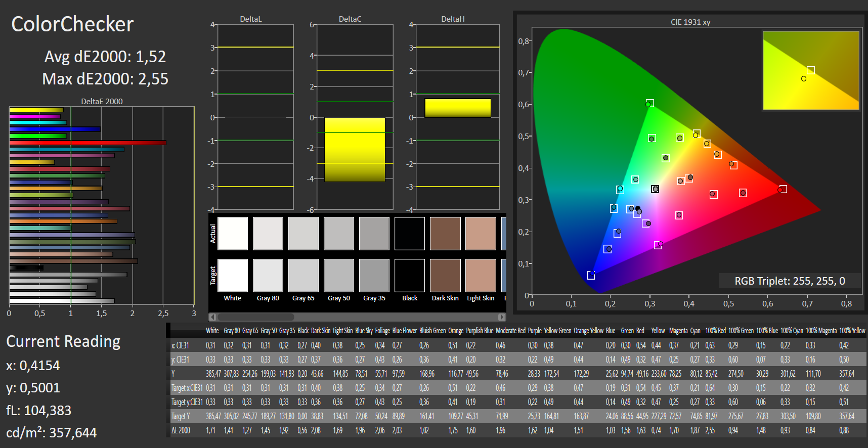 | Colorchecker dE 2000 calibrated * | 1.52 | 3.42 -125% | 2.05 -35% | 1.32 13% | |