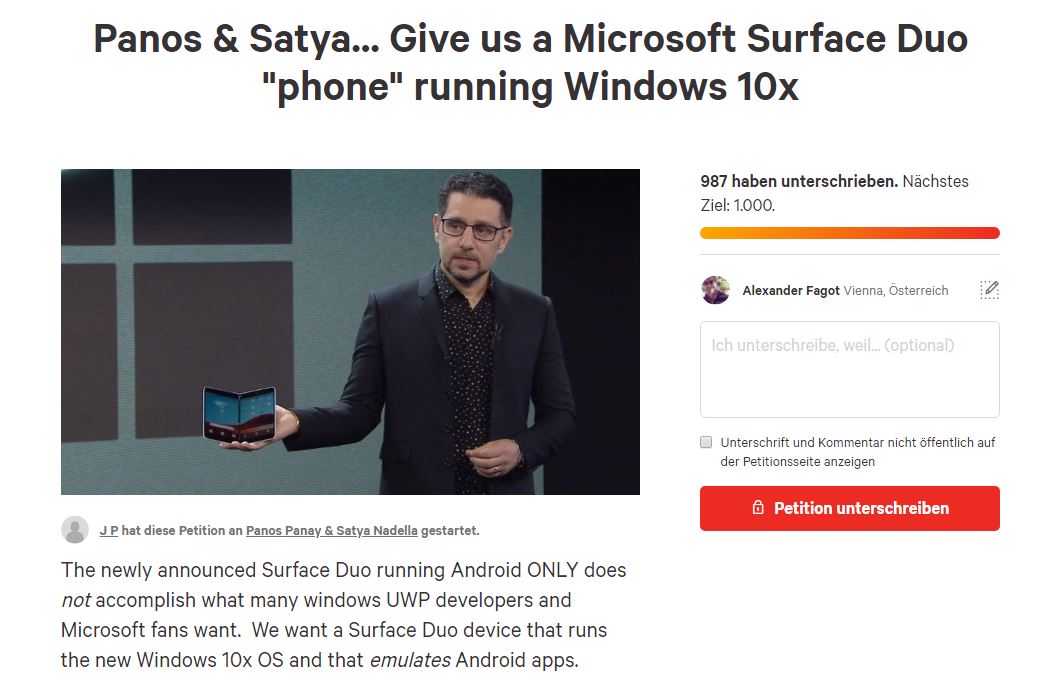 Und dennoch: Insbesondere einige Entwickler von UWP-Apps sind strikt gegen diesen Schwenk, wie eine Petition auf Change.org zeigt. Die Universal Windows Plattform versprach ihnen eine App, die auf allen Formfaktoren vom Smartphone bis zum Desktop-PC läuft, der Wechsel zu Android untergrabe diese Intention, weswegen sie ein Surface Duo mit dem Dual-Display-optimierten Windows 10X fordern, auf denen Android-Apps über eine Emulation weiterhin laufen könnten. Aktuell hat die Petition bereits knapp 1.000 Unterstützer, für einen Erfolg bräuchte es aber wohl deutlich mehr. Microsoft hat noch nicht im Detail dargelegt, wie viel Windows-Oberfläche auf dem Surface Duo mit Android-Basis übrig bleibt, hier wird wohl die Microsoft-Entwicklerkonferenz Build im Mai 2020 weitere Informationen liefern.