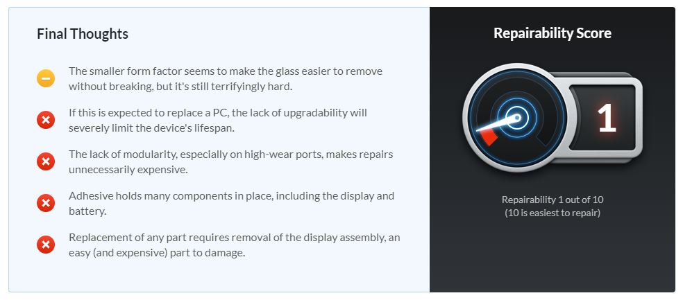 Eigentlich bewertet iFixit aber weniger die Auswahl der Komponenten als die Reparierbarkeit des jeweiligen Objekts in Form eines Repairability-Scores zwischen 1 und 10. Letzteres wäre der Idealwert, der höchst selten einmal erreicht wird, eine 1 die leider viel zu oft vergebene Abmahnung für schwierig instandzusetzende Hardwareprodukte. Auch das Surface Go fällt, wie frühere Surface-Modelle auch, in diese Kategorie 1, was iFixit mit kaum vorhandener Aufrüstbarkeit und Modularität, dem großflächigen Einsatz von Klebern und einer zwingenden und sehr schwierigen Entfernung des Displays bei jeglicher Art von Reparatur begründet.