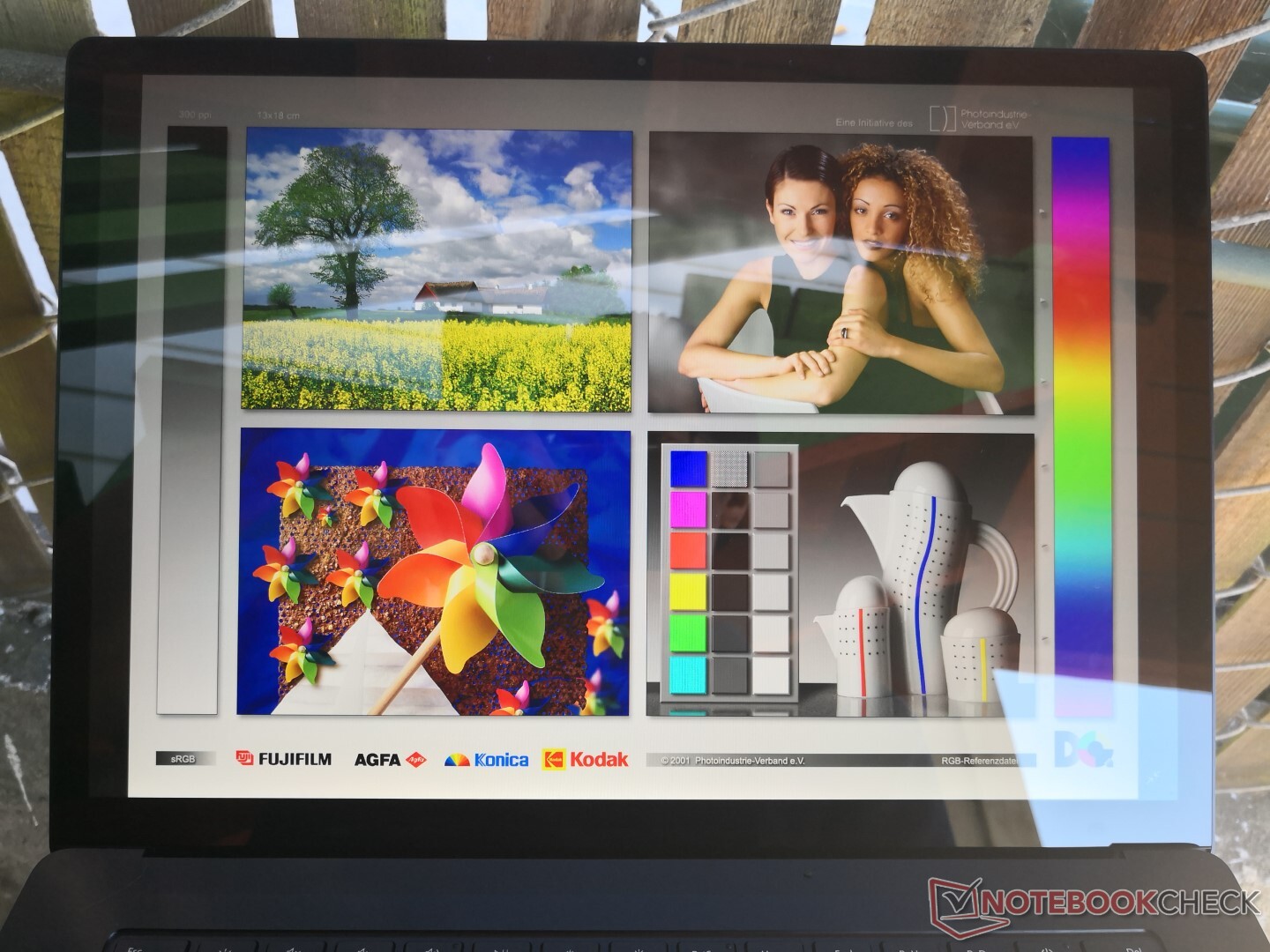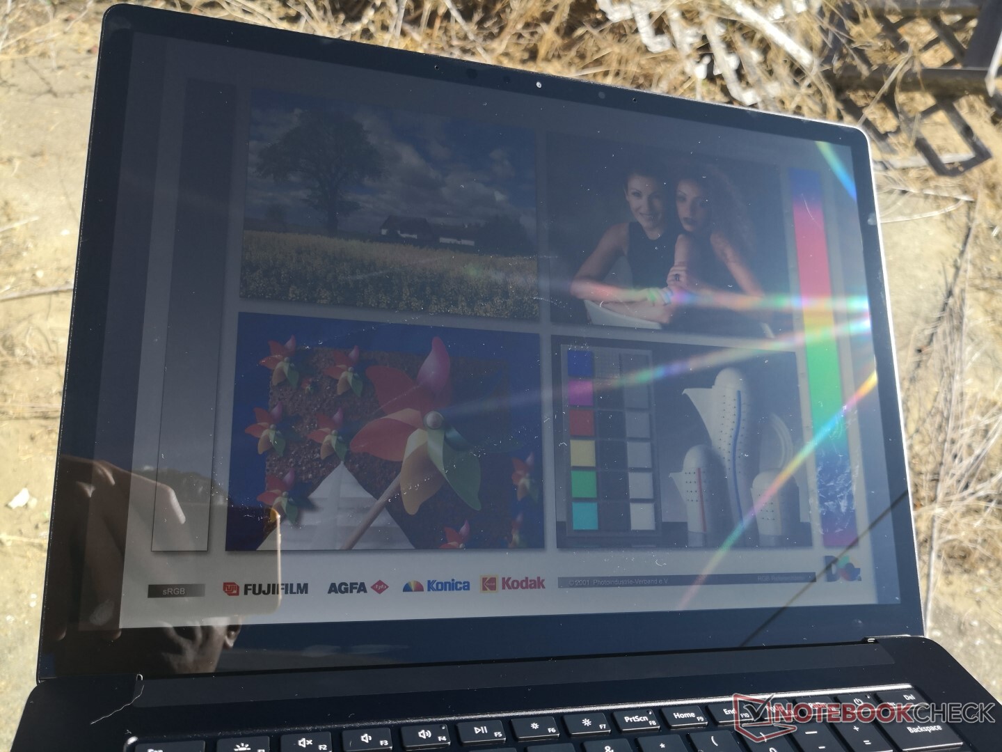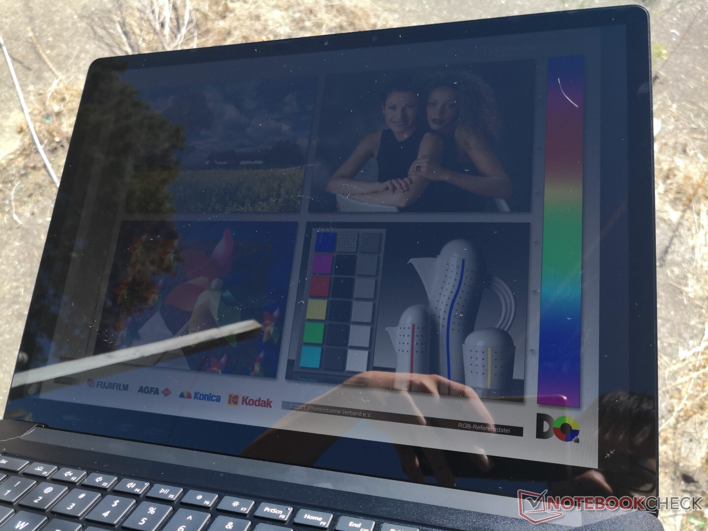 Die Lesbarkeit des Displays im Freien ist nicht so gut wie beim Dell XPS 15 7590 oder beim Apple MacBook Pro 15, da der Surface Laptop ein weniger helles Display hat. Läuft das Gerät im Akkumodus, wird die maximale Helligkeit leicht eingeschränkt und erreicht statt 412 cd/m² selbst ohne automatische Helligkeitsanpassung nur 403 cd/m². Manche Hersteller, wie etwa HP und Toshiba, bieten für ihre Business-Convertibles mittlerweile matte Touchscreens an, um der starken Blendung herkömmlicher glänzender Panele etwas entgegenzuwirken.