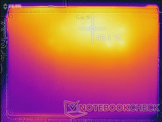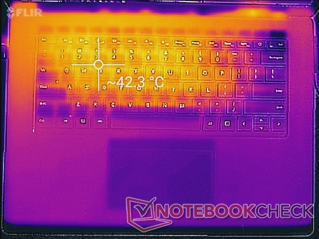 Die meisten Laptops haben Lüftungsgitter an der Gehäuseunterseite, um bei der Wärmeableitung zu helfen. Der Surface Laptop 3 lässt diese vollständig weg. Die Konsequenzen dieser Entscheidung sind ziemlich offensichtlich: Die durchschnittliche Oberflächentemperatur ist wärmer als für Ultrabooks üblich. Hotspots erreichen beim Gamen oder unter hoher Last an der Unterseite der Basiseinheit bis zu 50 °C. Sie sind auch großflächiger als zum Beispiel beim HP Spectre oder Asus ZenBook und sind somit auch beim Tippen oder wenn das Gerät auf dem Schoß verwendet wird stärker bemerkbar. Die meisten Tasten erreichen beim Gamen eine Temperatur von etwa 40 °C, während die Handballenablagen bei milden 35 °C liegen.