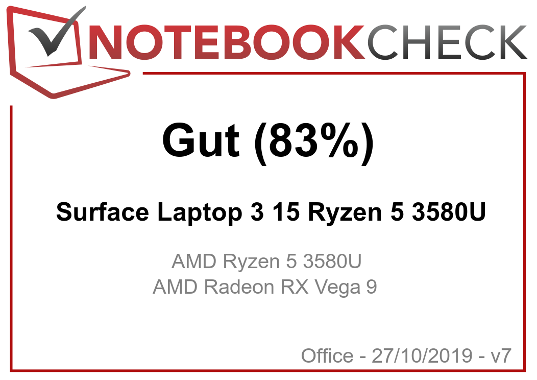 | 82.9 % v7 (old) | 10 / 2019 | Microsoft Surface Laptop 3 15 Ryzen 5 3580U R5 3580U, Vega 9 | 1.5 kg | 14.7 mm | 15.00" | 2496x1664 | |