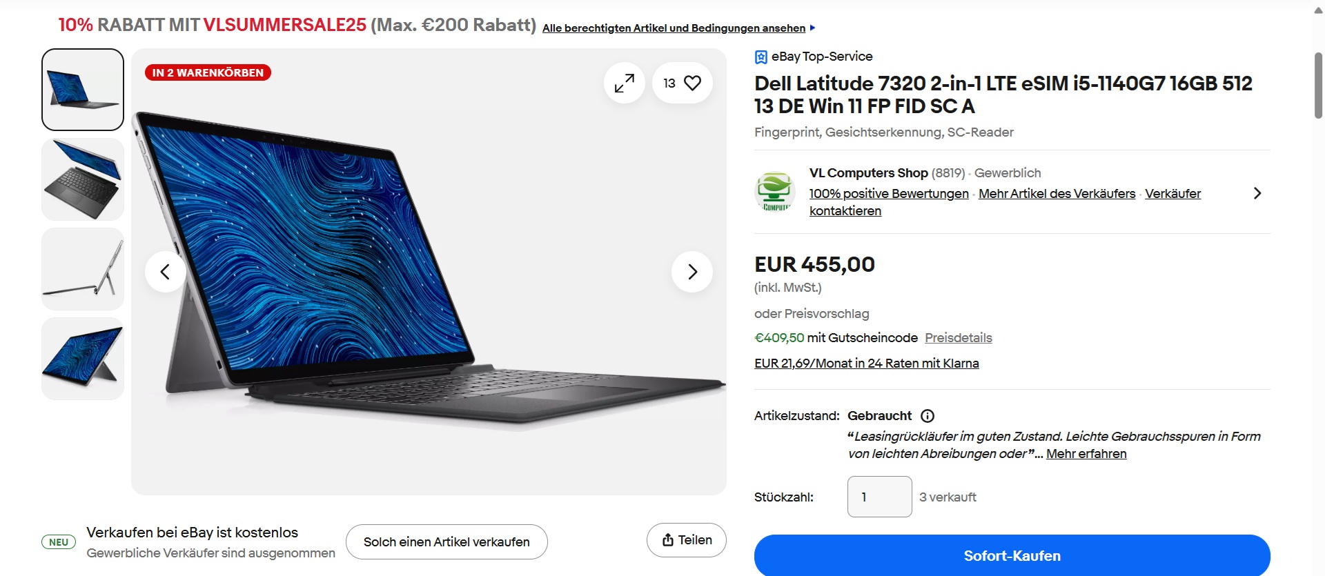 Dells 2-in-1-Laptop richtete sich seinerzeit an Unternehmenskunden, wird als Gebrauchtgerät aber auch für Privatnutzer sehr interessant. Aktuell ist eine gut ausgestattete Variante des Windows-Tablets samt ansteckbarer Tastatur zu einem Preis von 455 Euro auf eBay.de zu bekommen. Ein Rabattcode (VLSUMMERSALE25) senkt den Preis auf 409,50 Euro. Der Zustand des gebrauchten Detachables wird als „Gut“ bezeichnet. Ein Schwestermodell musste sich vor vier Jahren einem Test stellen und ergatterte dabei die Wertung "Sehr Gut (88 %)".