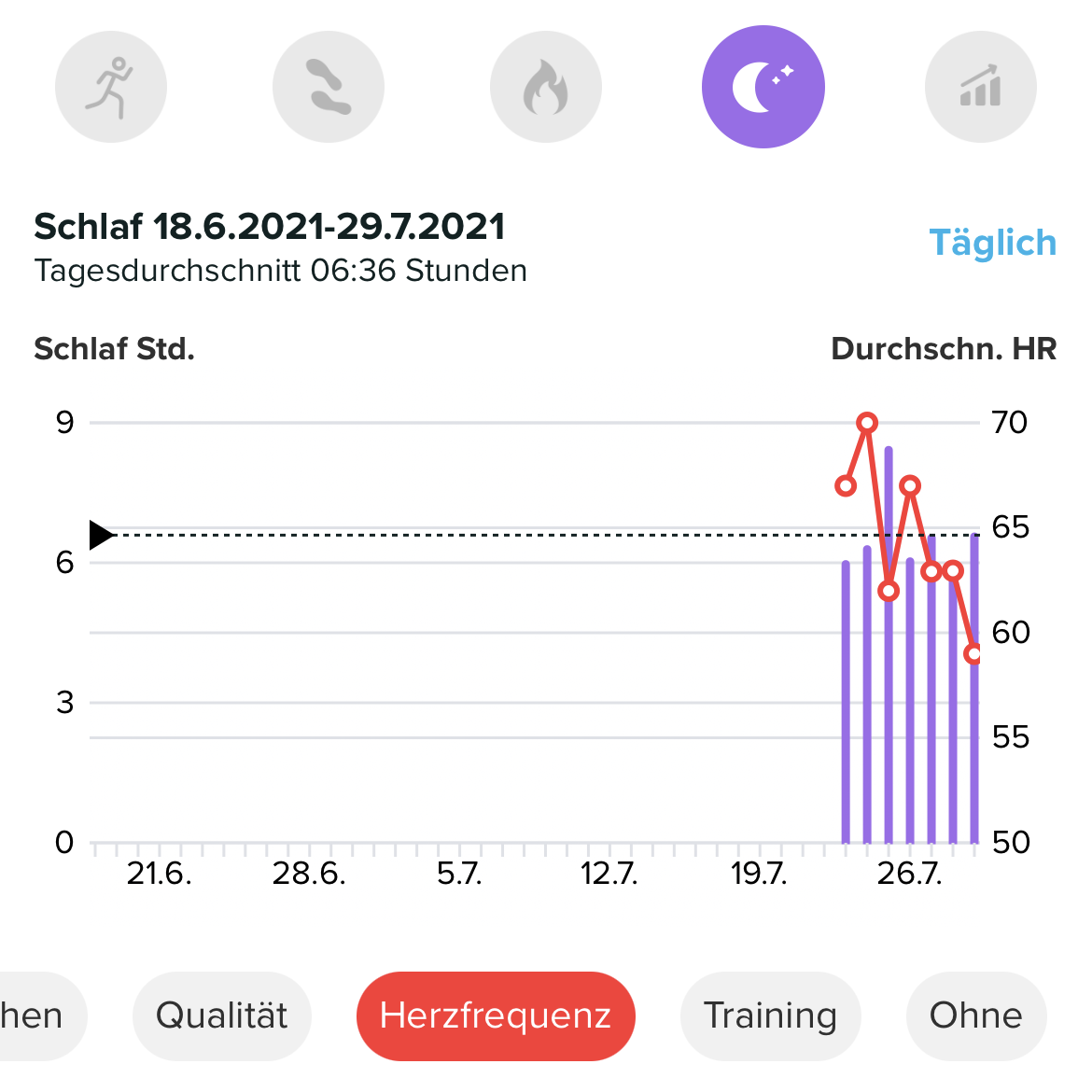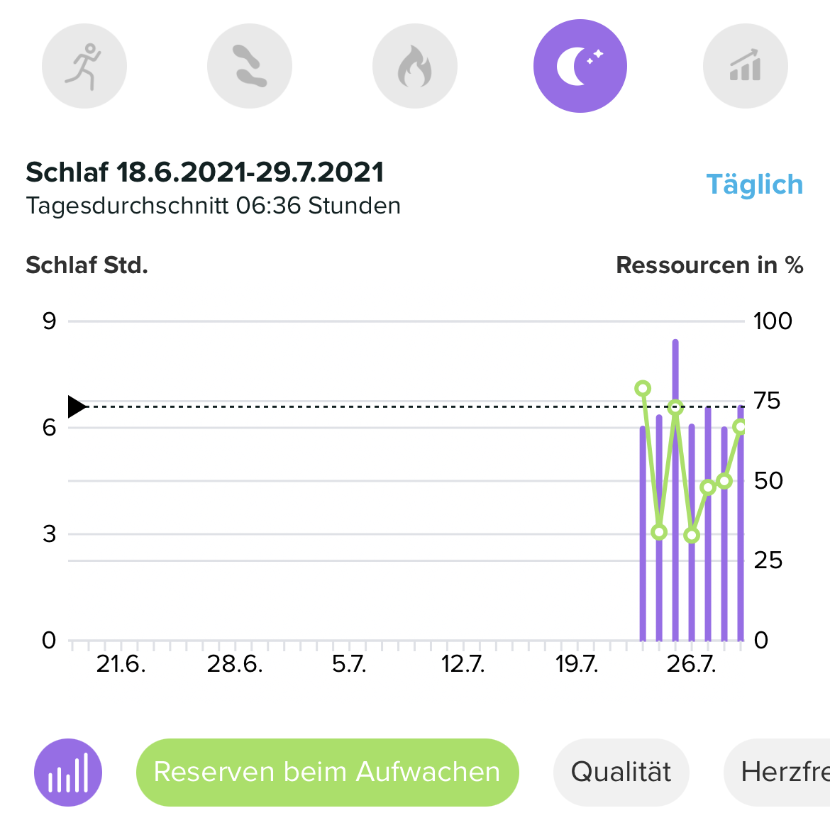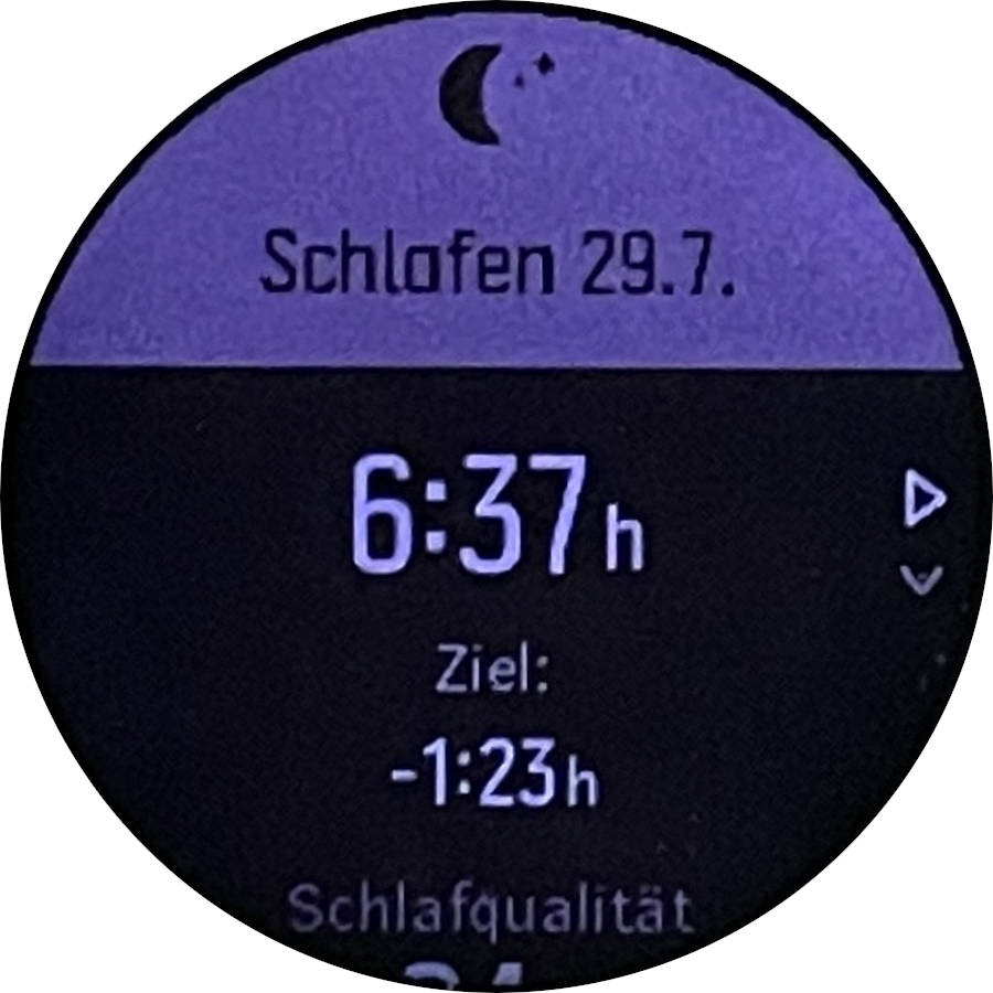 Die Smartwatch gibt Einschlaf- und Aufwachzeit wieder, Wach- und Tiefschlafzeit, Gesamtschlafdauer und durchschnittliche Herzfrequenz. Die letzten beiden Parameter auch für die zurückliegenden Tage. Die weiteren Schlafphasen, REM (Rapid Eye Movement) und leichter Schlaf, schlüsselt Suunto nicht auf. Die App kombiniert die Schlafdauer wahlweise mit der Schlafqualität, durchschnittlichen Herzfrequenz, Zahl der Trainingseinheiten oder den Reserven beim Aufwachen und zeichnet darüber ein Diagramm über mehrere Tage, Wochen, Monate oder Jahre.
