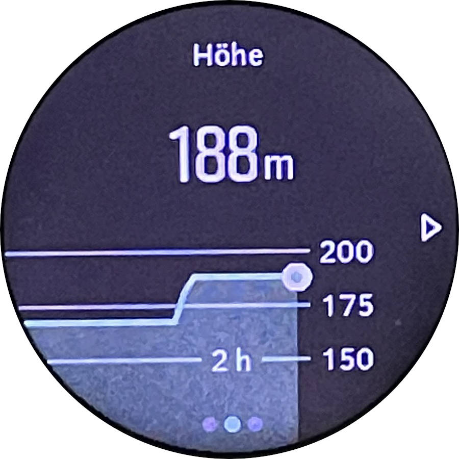 Ein langer Druck auf die mittlere Taste öffnet ein Schnellmenü, um kurzfristig einen Alarm, den Timer, den Nicht-stören-Modus oder eine permanente Hintergrundbeleuchtung zu aktivieren. Mehr als einen individuellen Alarm kann man bei der Suunto 9 nicht einstellen. Darüber hinaus meldet sie optional Unwetterwarnungen sowie tagesaktuell, dass die Sonne gerade auf- oder untergeht. Letzteres auf Wunsch früher, um beispielsweise rechtzeitig vor Einbruch der Dunkelheit den Rückweg anzutreten.