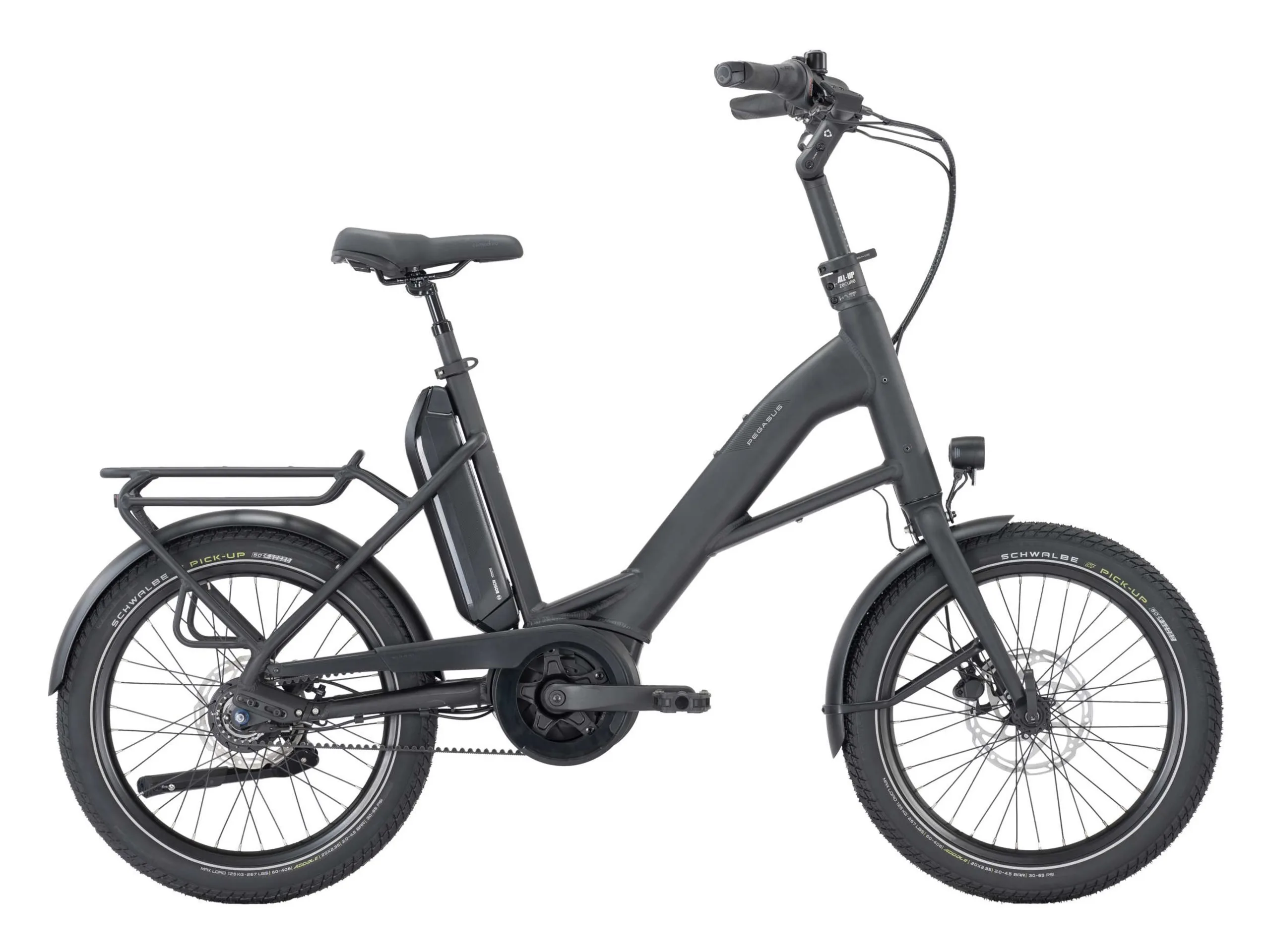 Pegasus bietet mit dem Swing E8F Belt ein E-Bike an, welches ein kompaktes Fahrrad, aber kein Faltrad ist. In der Praxis kann dies durchaus einen großen Unterschied machen - auch finanziell. So lassen sich klappbare Fahrräder auch etwa im Fernverkehr der Deutschen Bahn kostenfrei als Handgepäck mitnehmen und auch im Regionalverkehr oder öffentlichen Personennahverkehr ist dies oft möglich. Das Swing E8F Belt von Pegasus bringt dabei vorne und hinten 20 Zoll große Felgen mit, bietet im Gegensatz zu am Rahmen klappbaren E-Bikes - einen Mittelmotor. Genutzt wird ein Bosch Active Line Plus-Motor mit 50 Nm und der Unterstützung für das smarte System von Bosch. Gespeist wird der Motor von einem PowerPack-Akku mit einer Kapazität von 400 Wh, wobei sich dieser nicht in den Rahmen integriert ist, sondern am Sattelrohr befestigt wird.
