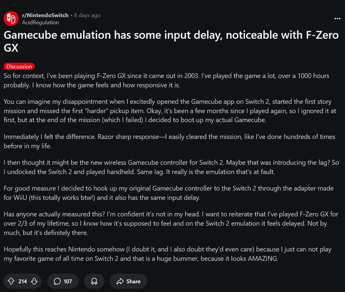 Nintendo ist sich der Beliebtheit seiner alten Konsolen bei Retro-Gamern bewusst. Um Käufer zum Upgrade auf die Switch 2 zu bewegen, hat das Unternehmen GameCube-Spiele für Abonnenten des Nintendo Switch Online + Expansion Packs eingeführt. Allerdings sind einige Fans von dem auf dem neuen Handheld verwendeten Emulator enttäuscht. Zu den Beschwerden zählen Eingabeverzögerungen und eine überempfindliche Steuerung, was sich auf Titel wie „F-Zero GX” auswirken kann.