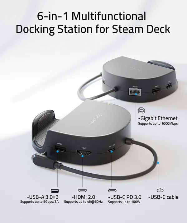 Der Hersteller Syntech ist kein ganz neuer Hersteller von Elektrogeräten und bietet nun auch Zubehör für das populäre Steam Deck an. Konkret offeriert Syntech neben einer Schutzhülle und auch einem 90-Grad-Adapter für den USB Typ C-Port jetzt auch eine Docking-Station. Die 6-in-1 Multifunctional Docking Station soll wie andere Produkte auch das Steam Deck besonders einfach auch stationär nutzbar machen.