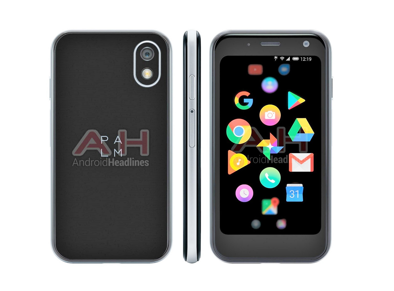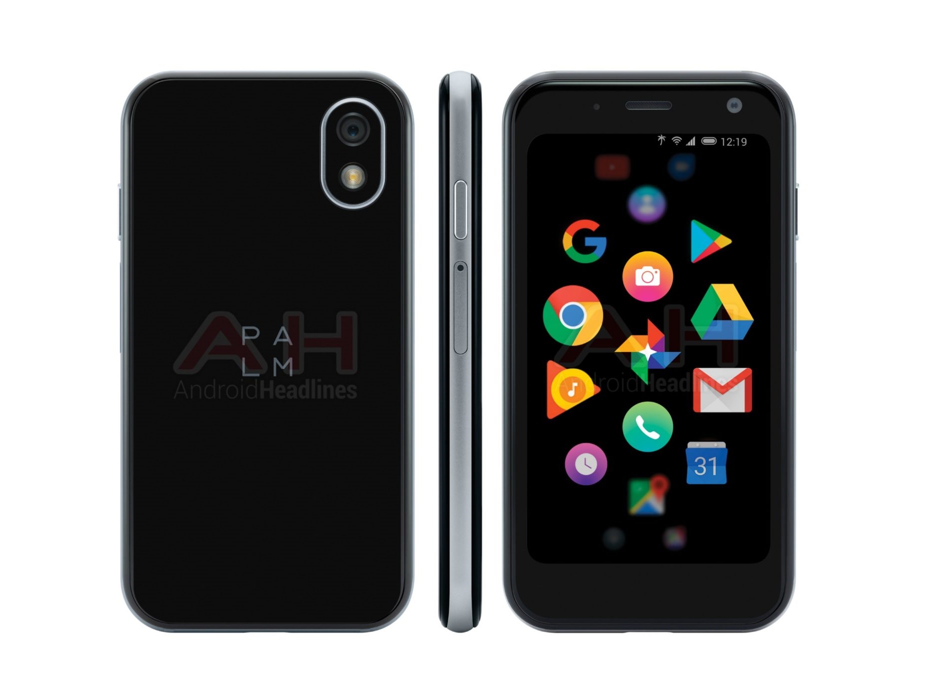 Wie man an dem unten aufgehellten Pressebild gut erkennen kann, hat Palm absolut keine Ambitionen, beim Randlos-Trend mitzumachen. Fast ein Drittel der gesamten Front ist schwarzer Rand, sowohl oben und unten als auch an den Seiten, was ebenso beim ersten iPhone von Steve Jobs der Fall war. Wie dieses ist auch das Pepito in ein rundliches Gehäuse gebettet, der physische Home Button des Apple-Phones fehlt allerdings. Auch an der Rückseite entfernt sich das Palm-Design vom Ur-iPhone und verbaut die Single-Cam an der Seite.