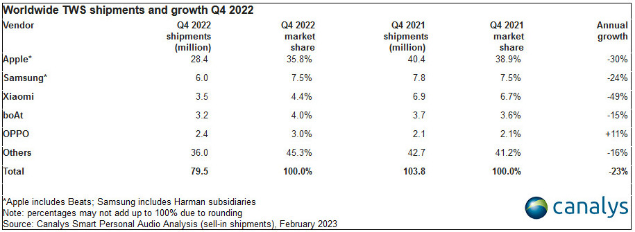 Für TWS-Audiogeräte verzeichnet Canalys im vierten Quartal 2022 einen Rückgang der Lieferungen auf 79,5 Millionen. In diesem Marktsegment sind die Lieferzahlen für kabellose TWS-Ohrhörer um 36 Prozent, die von drahtlosen TWS-Kopfhörern um 25 Prozent gefallen. Apple (einschließlich Beats) verzeichnete einen Rückgang von 30 Prozent gegenüber dem Vorjahr. Dank den AirPods Pro der zweiten Generation konnte Apple allerdings sein Führung bei den weltweit größten Anbietern von TWS-Audiogeräten halten. Die Apple AirPods Pro machten 63 Prozent aller Lieferungen der AirPods aus.