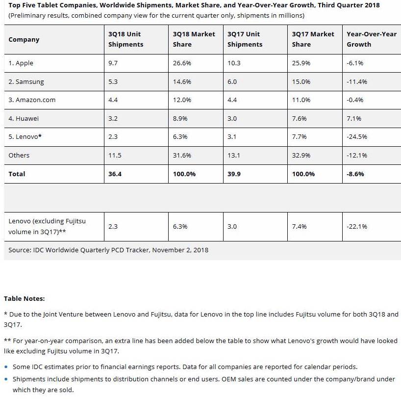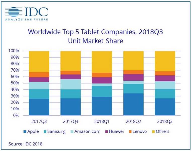Apple bleibt mit dem iPad nach wie vor die Nummer 1 bei den Tablets. Vor allem das Apple iPad 6 2018 verkauft sich laut IDC zu Preisen ab rund 330 US-Dollar in den Vereinigten Staaten sowie 350 Euro in Deutschland sehr gut. Wie bei den Smartphones steht Samsung auch bei den Tablet-PCs unter Druck. Amazon.com schaffte es in Q3/2018 zum drittgrößten Tablet-Hersteller hinter Apple und Samsung aufzusteigen. Huawei war der einzige Hersteller in den Top 5, der im 3. Quartal 2018 ein Wachstum (7,1 %) verzeichnen konnte. Die Talfahrt von Lenovo bei den Tablets setzte sich mit minus 24,5 Prozent fort.