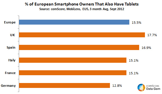 Die Analyse von comScore stützt sich auf Daten, die innerhalb des Zeitraums von 3 Monaten bis September 2012 im Rahmen des Benutzer-Trackings "MobiLens" erhoben wurden. Laut Bericht fanden die Marktbeobachter zudem heraus, dass rund 15,5 Prozent der Smartphone-Besitzer in Europa auch ein Tablet haben. Im vergangenen Jahr lag der Anteil noch bei 9,3 Prozent. Der Zuwachs von 6,2 Prozent sei ein weiterer Beleg für die enorme Akzeptanz von Tablet-PCs bei den Konsumenten.