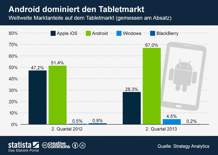 Google hat Apple und iOS mit seinem Betriebssystem (OS) Android inzwischen überholt und liegt nun mit einem Marktanteil von satten 67 Prozent sehr weit vor Apple. Der Anteil von Apple und seinem iPad schrumpfte im 2. Quartal im Vergleich zum Vorjahreszeitraum von 47,2 Prozent (Q2/2012) auf jetzt 28,3 Prozent. Insgesamt legte das weltweite Liefervolumen für Tablet-PCs zum Vorjahr um 43,2 Prozent, von 36,1 auf 51,7 Millionen Flachrechner zu.