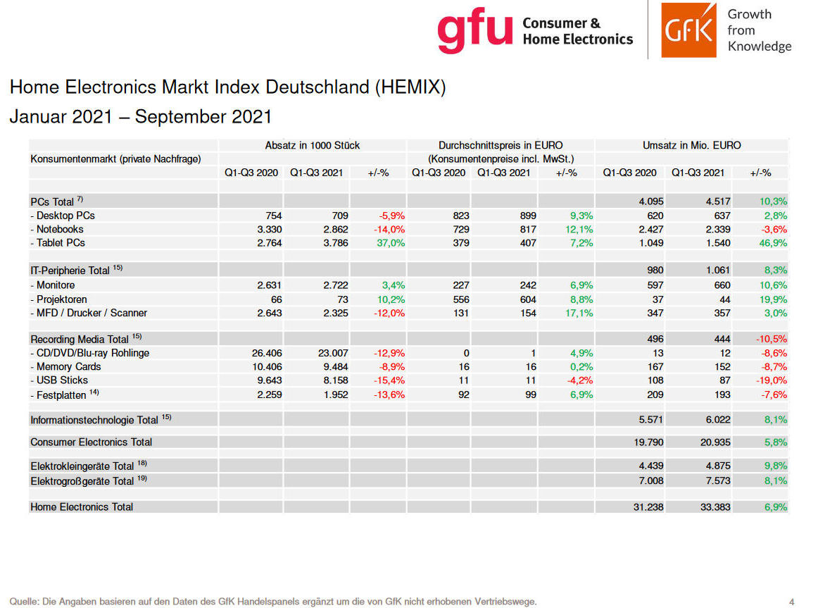 Demnach setzten Tablet-PCs als vielseitige Geräte für Arbeit und Unterhaltung ihren Markterfolg auch im dritten Quartal 2021 ungebremst fort. So wurden laut HEMIX von Januar bis September 2021 in Deutschland knapp 3,8 Millionen Tablet-Computer verkauft. Das ist ein Plus von 34 Prozent im Vergleich zum Vorjahreszeitraum. Die Umsatzsteigerung mit einem Zuwachs um 43 Prozent auf mehr als 1,5 Milliarden Euro viel noch höher aus. Der Durchschnittspreis aller verkauften Tablet-PCs stieg in den ersten drei Quartalen des Jahres 2021 um 7,2 Prozent auf 405 Euro.