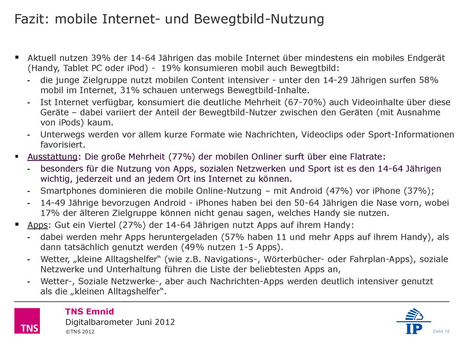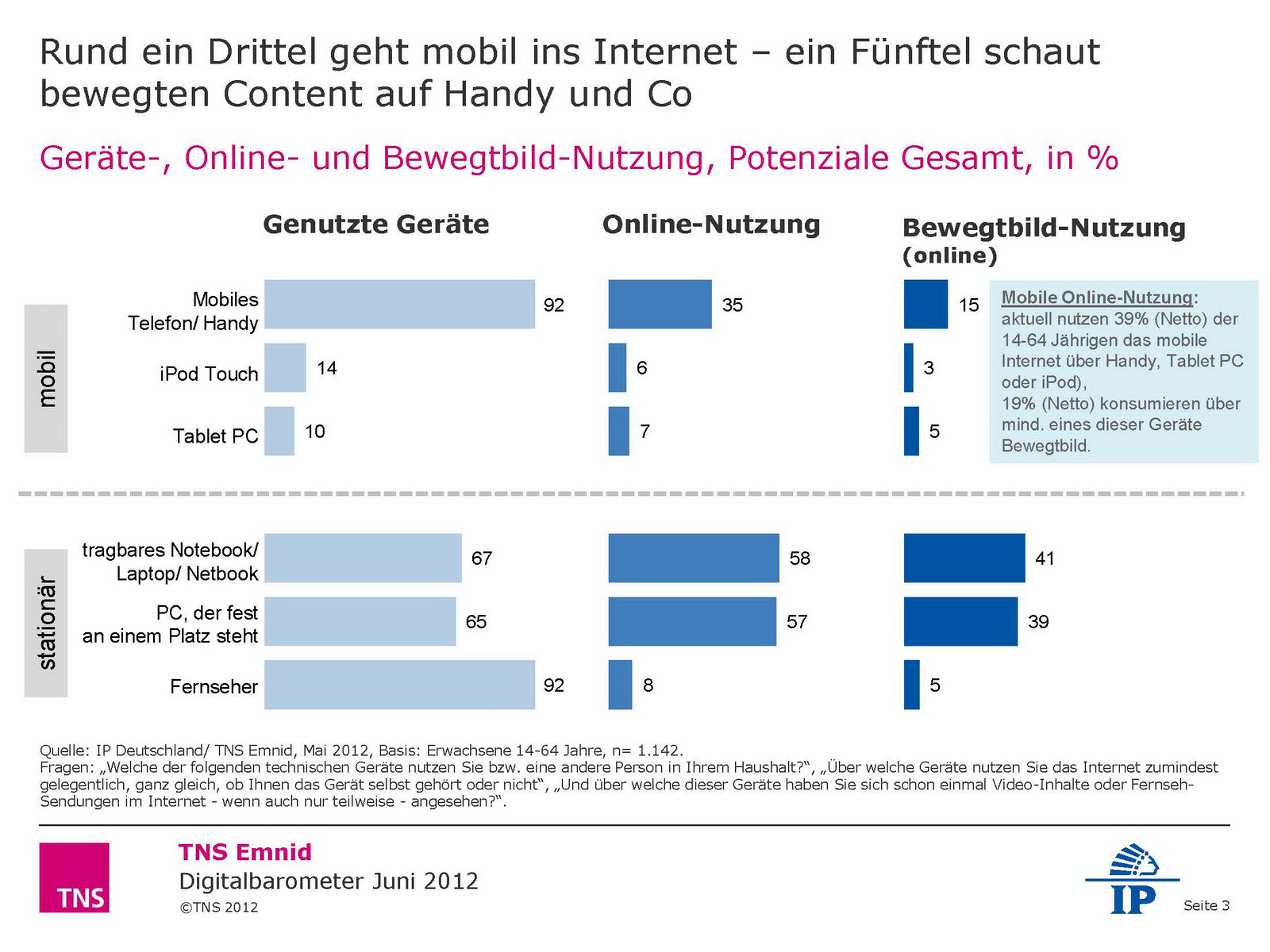Laut den Ergebnissen aus dem aktuellen DigitalBarometer, einer Kooperation von TNS Emnid, IP Deutschland und der Fachzeitschrift Werben & Verkaufen, nutzt inzwischen mehr als ein Drittel der Deutschen das Internet über mobile Endgeräte. Jeder Fünfte schaut auch Videoinhalte über Handy, Tablet-PC oder iPod. Im Rahmen der Untersuchung wurden 1.142 Erwachsene im Alter von 14 bis 64 Jahren befragt, wie sie Videoinhalte und Apps im mobilen Internet abfragen respektive nutzen.