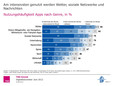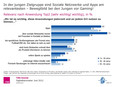 Hauptmotive für die mobile Internetnutzung unterwegs: Apps und Soziale Netzwerke. Apps treiben mit 58 Prozent, die Kontaktpflege in Sozialen Netzwerken mit 56 Prozent und Informationen zu sportlichen Großereignissen mit 30 Prozent die zunehmend mobile Internetnutzung voran. Bei den 14- bis 29-Jährigen rangiert die Nutzung von Sozialen Netzwerken mit 73 Prozent sogar noch vor den Apps. Produktinformationen während eines Einkaufs sehen 25 Prozent als wichtige Anwendung für unterwegs. Für jeweils 13 Prozent sind Onlinespiele und Videoinhalte unterwegs wichtig.