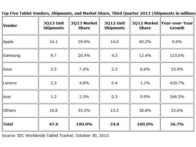 Im Ranking der Top 5 der weltweit größten Tablet-Hersteller kann sich Apple mit 14,1 Millionen iPad Tablet-PCs im 3. Quartal 2013 auch weiterhin auf Platz 1 behaupten. Allerdings muss Apple zusehen, wie die Konkurrenz von Samsung und Co. mit Riesenschritten aufholt. So sank der Absatz von 14,6 Millionen iPads in Q2/2013 auf 14,1 Millionen im 3. Quartal 2013. Im Jahresvergleich (Y-o-Y) tritt Apples iPad-Familie mit plus 0,6 Prozent quasi auf der Stelle.