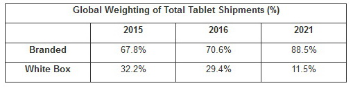 2015 lag der Anteil von Marken-Tablets laut ABI Research bei 67,8 Prozent und der von White-Box-Tablets bei 32,2 Prozent. Im Jahr 2016 soll das Verhältnis bei 70,6 und 29,4 Prozent liegen. Bis zum Jahr 2021 sehen die Analysten dann einen Shift bei den Markengeräten auf einen Marktanteil von 88,5 Prozent. Der Anteil von White-Box-Tablet-PCs wird im Gegenzug dann auf nur noch 11,5 Prozent sinken.