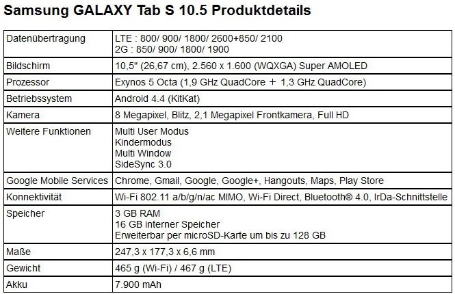 - Samsung Galaxy Tab S 10.5 LTE: 599 Euro