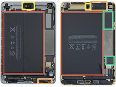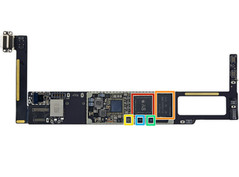 Bei den Komponenten des 6,1 mm dünnen iPad mini 4 ist der, im Vergleich zum 7,5 mm flachen Vorgänger iPad mini 3 (2 Zellen, 6471 mAh), deutlich schwächere Akku (1 Zelle) mit einer Kapazität von 5124 mAh zu nennen. Als Chipsatz findet sich wie erwartet, der Apple A8 APL1011 SoC plus M8 Motion-Coprozessor, der von 2 GB LPDDR3-SDRAM (SK Hynix) flankiert wird.