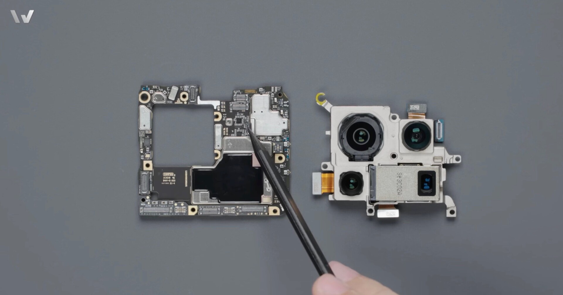 Erstmal im Inneren angekommen, können die Antennen und die Qi-Ladespule mit zehn Schrauben entfernt werden. Anschließend kann bereits die 32 Megapixel Selfie-Kamera auf Basis des OmniVision OV32C aus dem Gehäuse genommen werden, genau wie das gigantische Kameramodul, das alle vier Objektive beherbergt. Die Hauptkamera ist durch den 1 Zoll Sensor und das Leica Summicron-Objektiv derart groß, dass Xiaomi sogar Platz am darunter liegenden Mainboard aussparen musste.