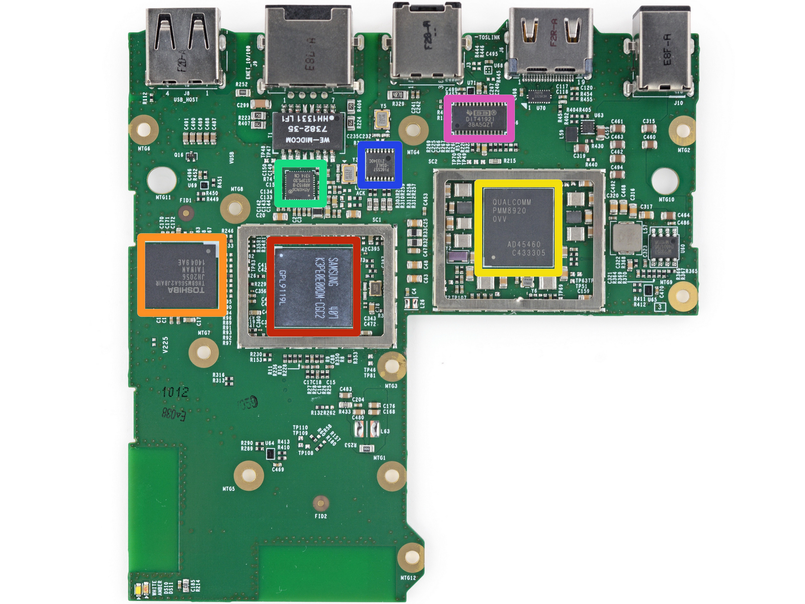 Auf dem Mainboard finden sich neben dem Qualcomm-Chipsatz auch 2 GByte LPDDR2-RAM von Samsung, 8 GByte eMMC NAND-Flash von Toshiba sowie die Zusatzchips für Netzwerk und Sound. In der Fernbedienung tummelt sich hingegen vornehmlich Elektronik von Texas Instruments (TI) und das Mikrofon für die sprachgesteuerte Suche. Der Bluetooth-Gaming-Controller lässt sich wegen Spezialschrauben nicht so einfach öffnen, im Inneren findet sich übliche Controller-Technik.