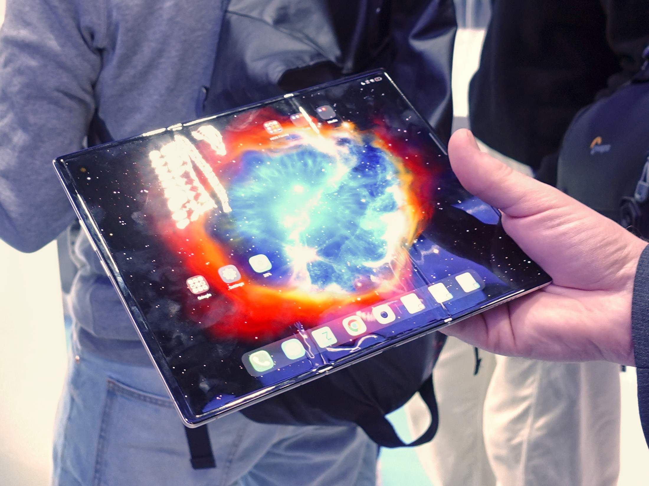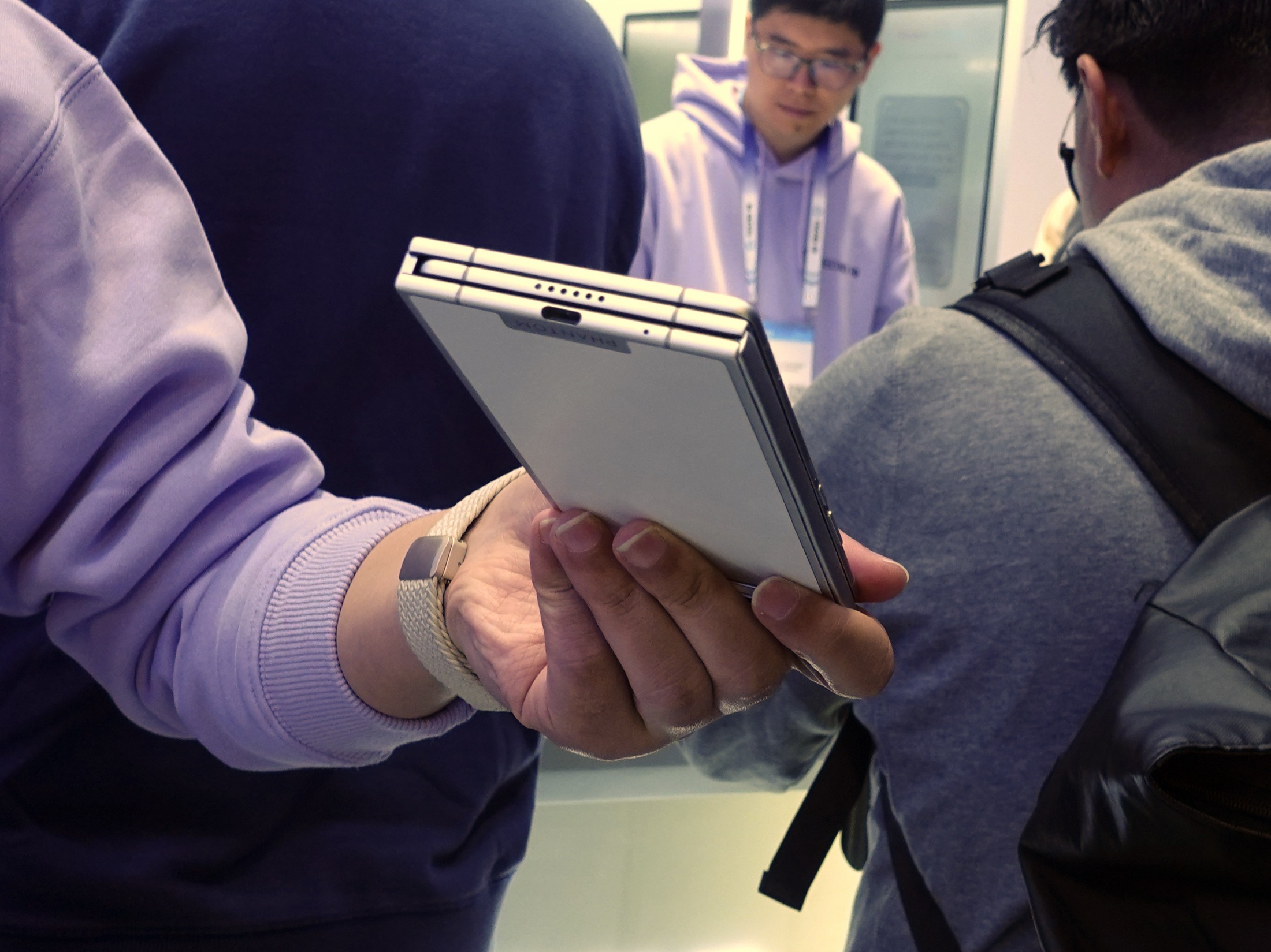 Ein weiteres Highlight unseres Rundgangs war das Phantom Ultimate G Fold Concept. Das Smartphone lässt sich an zwei Scharnieren nach innen zusammenklappen, wodurch das Hauptdisplay beim Transport sicher geschützt ist. Zusammengeklappt misst es 11,49 Millimeter, entfaltet offenbart sich ein 9,94 Zoll großer Bildschirm bei einer enorm dünnen Gehäusetiefe von 3,49 Millimetern. Das Gerät fühlte sich in der Hand dank des speziellen Stahls in den Scharnieren und der Titanfaser-Rückseite erstaunlich stabil an.