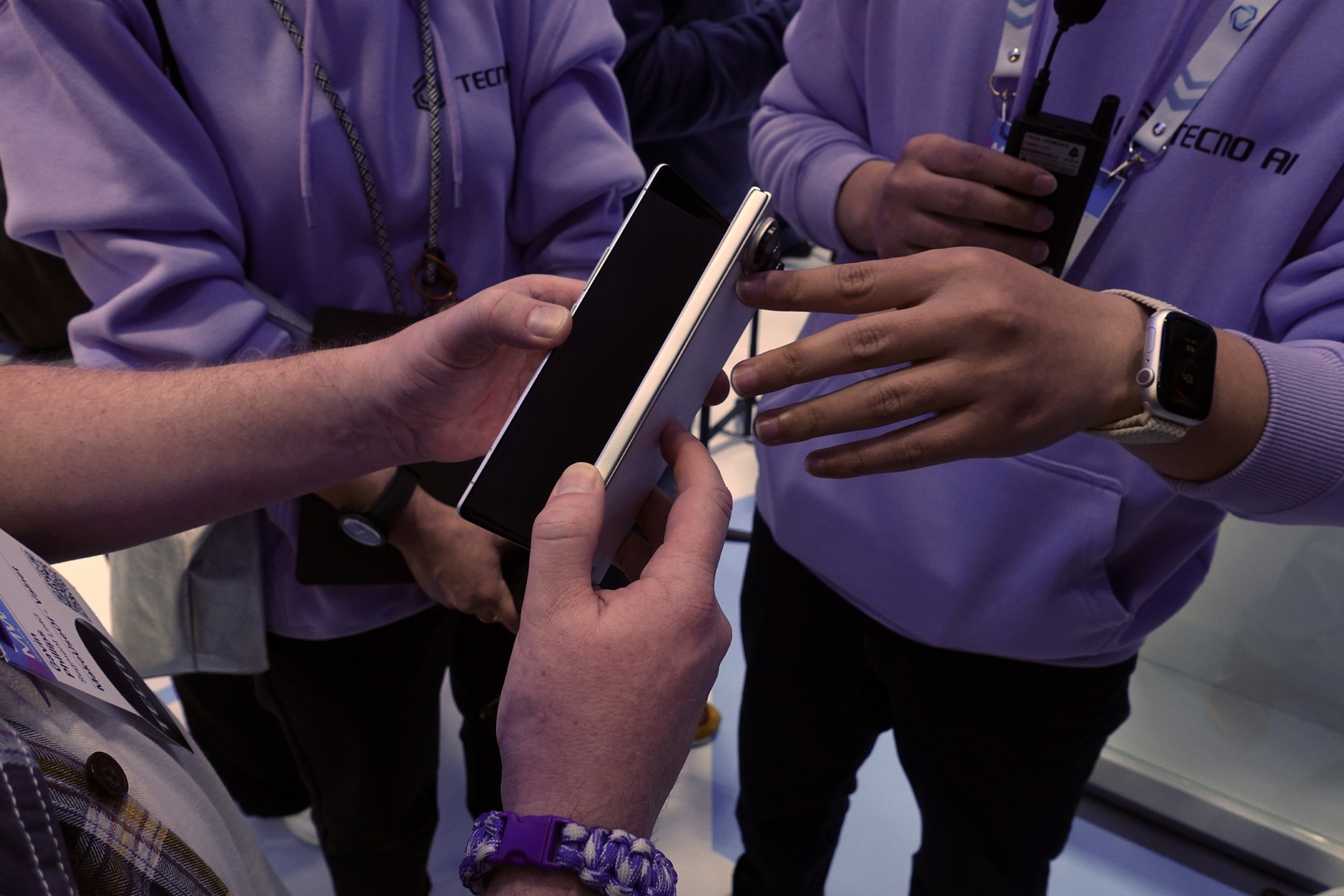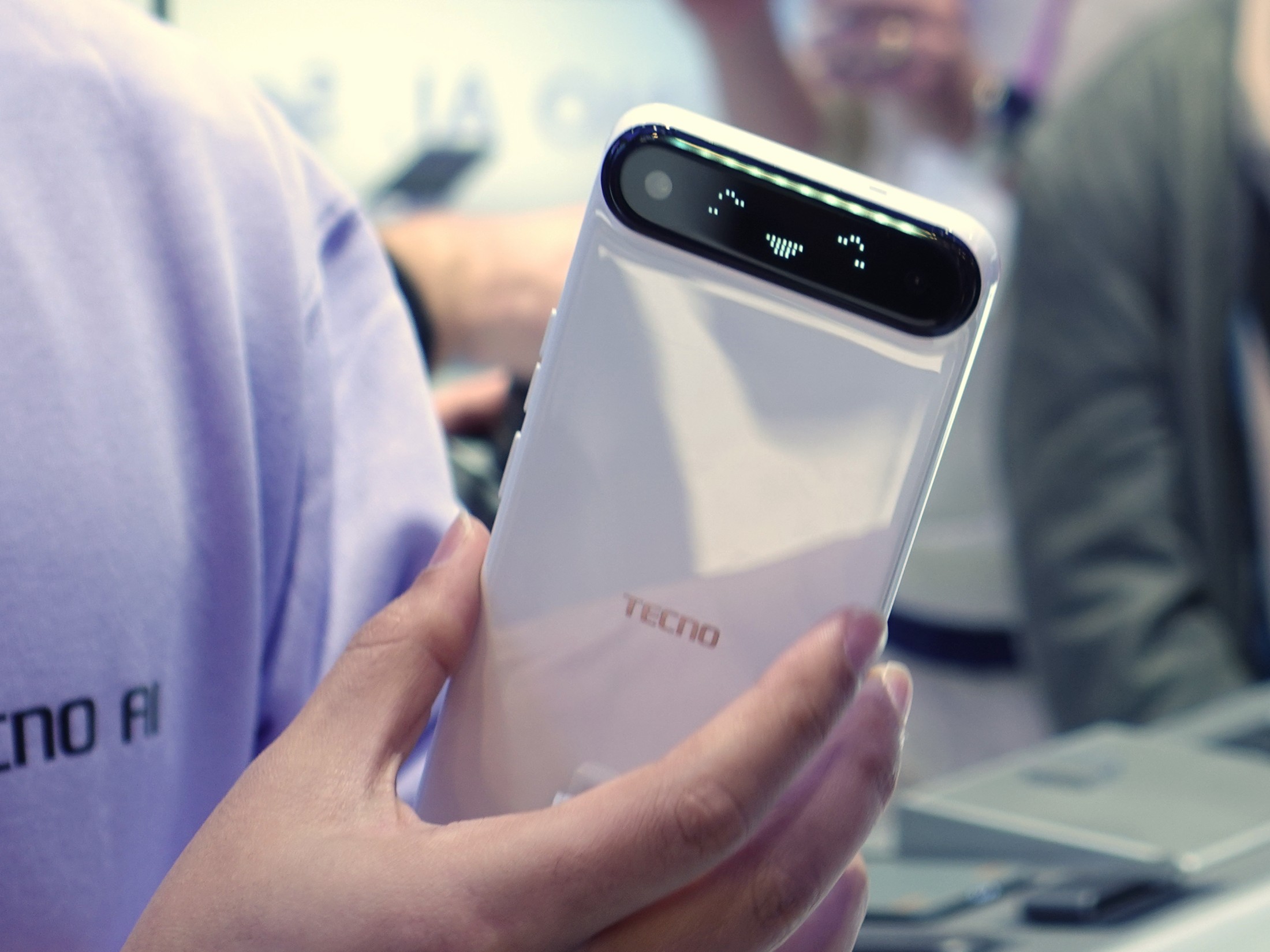 Am Stand gab es zudem weitere Hardware-Konzepte zu entdecken. Das AI EINK passt die Farbe seiner E-Ink-Rückseite an die Umgebung an, die von der Kamera erfasst wird. Das TECNO Slim 2 fiel uns mit einem extrem schmalen Bildschirmrand von nur 0,7 Millimetern auf, während das POVA Neon mit einer auffälligen Gehäusebeleuchtung aus ionisiertem Edelgas ausgestattet ist und an die Plasmakugeln aus den 90er Jahren erinnert.