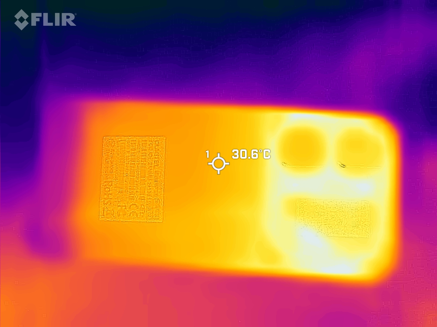 (+) Auf der Unterseite messen wir eine maximalen Wert von 37.1 °C (im Vergleich zum Durchschnitt von 34 °C).