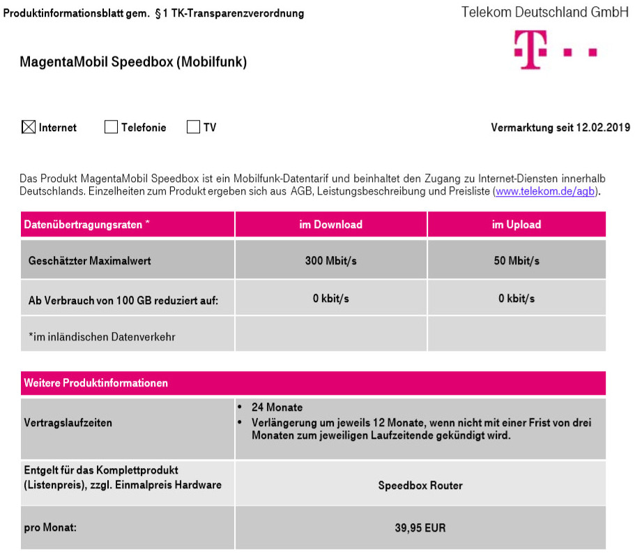 Für monatlich 39,95 Euro bekommen die Telekom-Kunden 100 GB Inklusivvolumen für die Nutzung innerhalb Deutschlands. Der Bereitstellungspreis beträgt einmalig 39,95 Euro. Für den Speedbox Router selbst fällt einmalig ein Preis von 1 Euro an. Die Laufzeit beträgt 24 Monate. Mit der Option SpeedOn können 15 GB für 14,95 Euro oder 30 GB für 29,95 Euro bei Bedarf hinzugebucht werden.