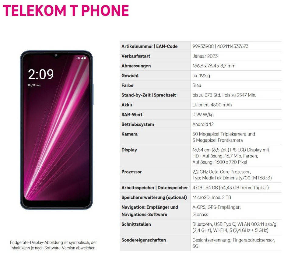 Für das günstigere T Phone der Telekom kommt ein 6,5 Zoll großes IPS-LCD-Display mit HD+-Auflösung zum Einsatz, dem teureren T Phone Pro spendiert die Telekom ein 6,8-Zoll-Display (IPS), ebenfalls mit HD+. Bei den Kameras der Telekom-Handys ebenfalls Unterschiede. Das T Phone integriert eine 50-MP-Triplekamera und 5-MP-Frontkamera, das T Phone Pro hat für Fotos und Videos eine 50-MP-Quadkamera und 16-MP-Selfiekamera an Bord.