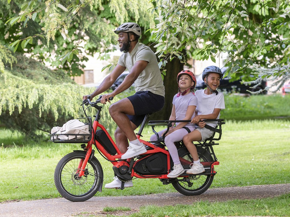 Herstellerangaben zufolge kann der verlängerte Gepäckträger mit maximal 80 Kilogramm beladen werden. Damit ist es möglich, zwei Kinder oder einen größeren Mitfahrer mitzunehmen. Die Mitnahme von kleineren Kindern ist dabei sowohl auf einer durchgehenden Sitzbank möglich als auch auf zwei einzelnen Kindersitzen. Auch wenn zwei Kinder mitgenommen werden und der Gepäckträger dementsprechend belegt ist, kann trotzdem Gepäck transportiert werden - und zwar auf einem Frontgepäckträger. Lange Gepäcktaschen lassen sich nutzen, wenn keine weiteren Personen transportiert werden müssen.