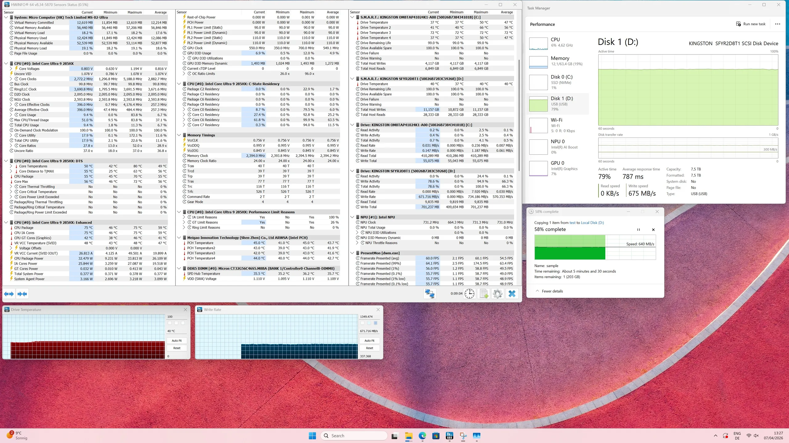 Im Temperatur- und Stresstest liefert die TerraMaster D1 SSD zusammen mit der Kingston Fury Renegade G5 8 TB überzeugende Ergebnisse. Selbst unter anhaltender Belastung bleiben die Temperaturen dank des Aluminiumgehäuses und der effektiven Kühlung im sicheren Bereich. Leistungseinbrüche oder Throttling treten nicht auf, sodass konstante Transferraten gewährleistet sind.