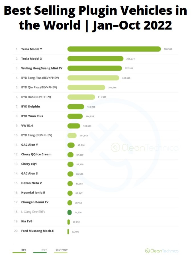 Auch gemäß anderen Datenquellen sind das Tesla Model Y und Tesla Model 3 im Jahr 2022 von Januar bis Oktober 2022 die meistverkauften Elektroautos der Welt. So kommt CleanTechnica beispielsweise in seiner Auswertung zu dem Ergebnis, dass Tesla bis Oktober 2022 bisher 568.965 Model Y verkauft hat, vom Elektromodell Model 3 insgesamt 365.274 E-Autos. Zusammen macht das 934.239 Tesla-Autos bisher im Jahr 2022. Dahinter folgen dann die starken chinesischen Automarken Wuling (HongGuang Mini EV) von Saic-GM sowie BYD. Volkswagen kommt mit dem VW ID.4 auf Rang 9 (130.623 BEV).