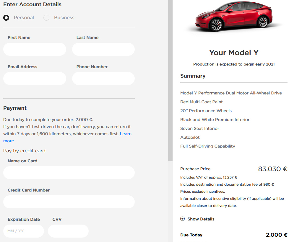 Das Topmodell des Elektro-SUV Model Y erreicht als Performance-Variante eine Höchstgeschwindigkeit von 241 Stundenkilometern. Der Spurt von 0 auf 100 km/h wird in nur 3,7 Sekunden absolviert. Damit die Kraft auch sicher abgebremst wird spendiert Tesla dem Model Y Performance 20-Zoll-Räder und stärkere Bremsen. Mit Komplettausstattung kostet der Tesla Model Y Performance im deutschen Onlinekonfigurator aktuell 83.030 Euro.