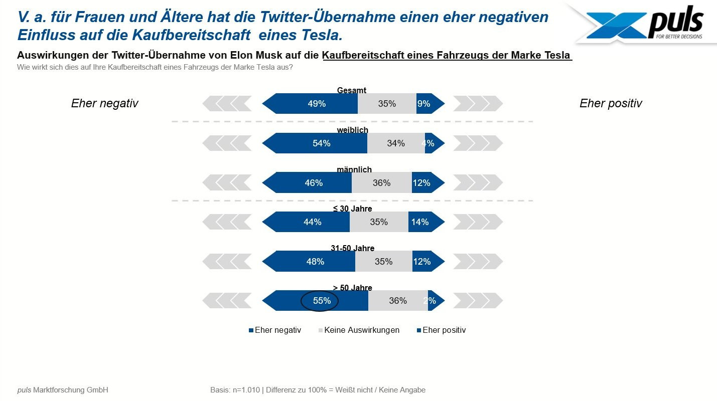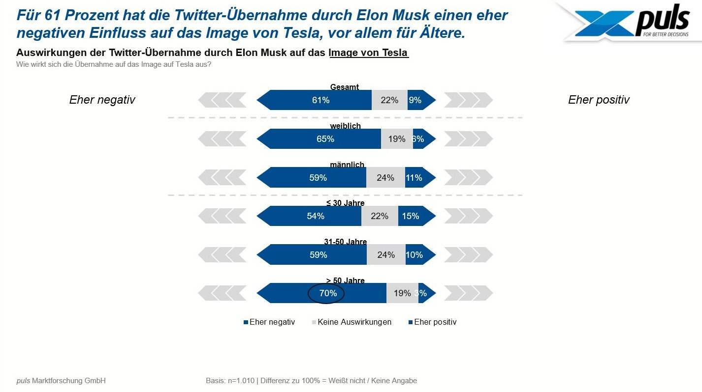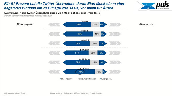 Die Nürnberger Puls Marktforschung ist der Frage nachgegangen, ob und welche Auswirkungen die Übernahme von Twitter auf Musks Elektro-Automarke Tesla hat. Die Puls-Studie, in der über tausend Autokäuferinnen und Käufer in Deutschland befragt wurden, zeigt überraschend eindeutig, dass Musk damit wohl Grenzen überschritten hat. 61 Prozent der Befragten gaben an, dass die Twitter-Übernahme einen negativen Einfluss auf das Image von Tesla hat. Unter weiblichen und älteren Autokäufern (über 50 Jahren) liegen diese Anteile sogar bei 65 und 70 Prozent.