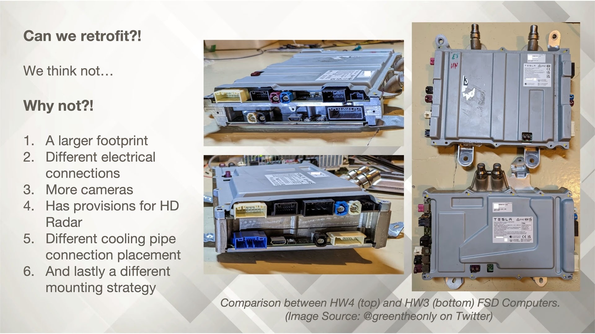 Für HW3-Besitzer, die für FSD bezahlt haben und nun feststellen müssen, dass ihre Autos nicht in der Lage sind, das spannendste FSD-Update aller Zeiten auszuführen, hält Tesla zwei Lockangebote bereit. Kunden, die FSD erworben haben, wird entweder eine vergünstigte Inzahlungnahme für ein AI4-Fahrzeug oder die Option angeboten, sowohl den Computer als auch das Kamera-Kit auszutauschen. Die Nachrüstung („Retrofit“) selbst wäre keine Kleinigkeit, da Musk zum ersten Mal bestätigte, dass die Upgrades sowohl neue Kameras als auch den leistungsstärkeren AI4-Computer beinhalten müssen, was bedeutet, dass eine teilweise Demontage des Fahrzeugs anstehen wird.