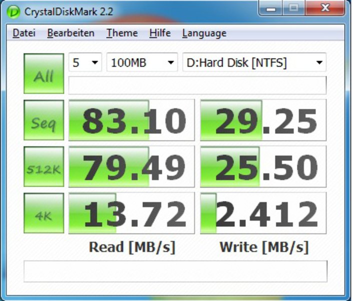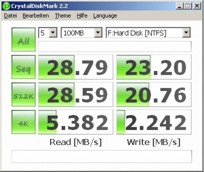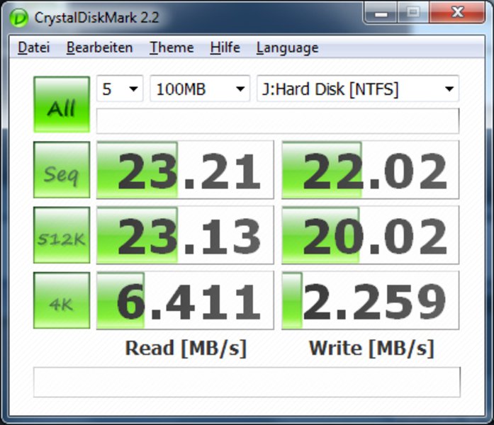 Ungewöhnlich war eine mit um die 22 MB/s niedrige USB 2.0 Übertragung am HP Probook 6540b, welches sonst um die 28 MB/s leisten kann. Das scheint aber eine Eigenart des Probook im Zusammenspiel mit dem Nobility Stick N005 zu sein, da bereits das HP Mini 5101 Netbook mit 28,8 MB/s deutlich schneller zu Werke ging. Am Desktop haben wir mit USB 2.0 schließlich knapp 34 MB/s erreicht.
