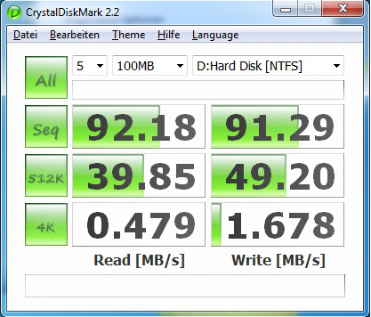 Am USB 3.0 Anschluss des MSI Mainboards konnte die ADATA schließlich zeigen, was sie kann. Hier erzielten wir beim HD Tune (Lesen) maximal 89,6 MB/s und beim Crystal Disk Mark (sequentielles Lesen und Schreiben) 91 MB/s. Damit wird die Leistungsfähigkeit der intern verbauten Festplatte ausgereizt und man erreicht um die 3-fache Geschwindigkeit im Vergleich zu alternativen 2,5“ USB 2.0 Festplatten. Die Zugriffszeiten liegen bei 17,2 ms. Das ist für konventionelle Festplatten ein üblicher Wert, der lediglich von SSDs spürbar unterboten wird. Siehe im Vergleich dazu auch unsere umfangreiche HDD-Benchmarkliste.