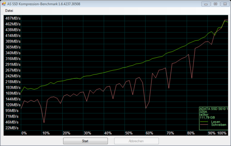 Beim Kompressions-Benchmark der AS SSD Suite zeigt sich das typische Bild von SandForce basierten Solid State Drives. Je stärker die Daten komprimiert werden können, desto schneller können die Daten gelesen und geschrieben werden. Die Spanne reicht von durchschnittlich 130 bis 470MB/s, wobei die Leseraten nicht so stark einbrechen.