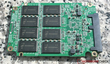 Im Inneren unseres Testgerätes fanden wir 16 Stück 8GB Micron 29F64G08CBAAA MLC NAND Module und natürlich den SandForce SF-2281VB1-SDC Controller.